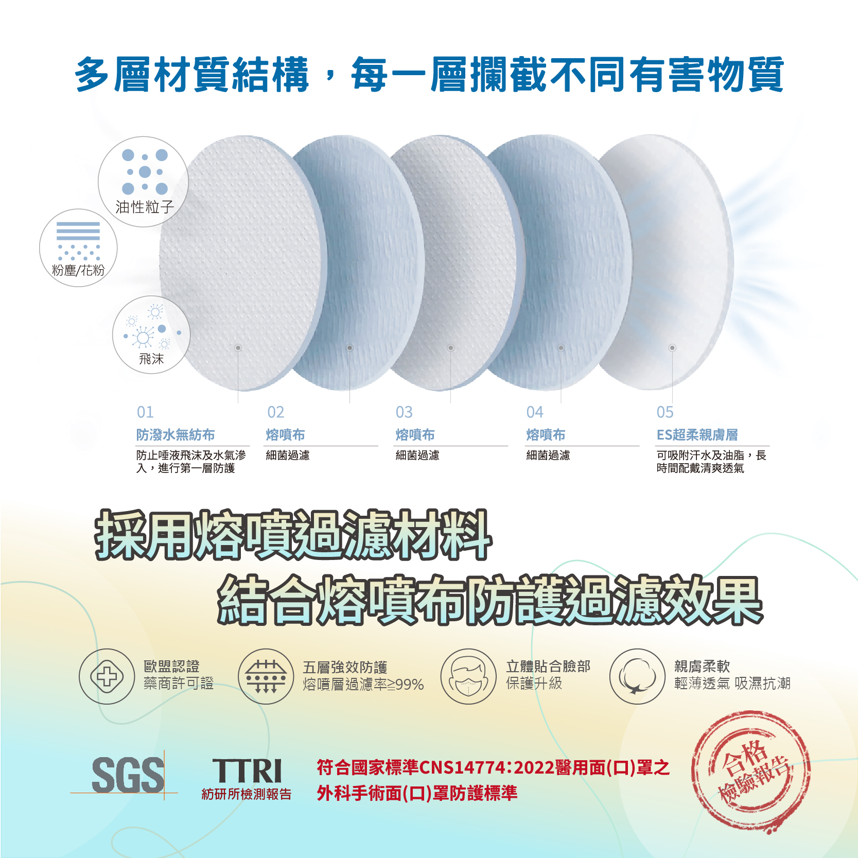 二、主動吸收菌毒體、液體噴到口罩時的防護醫療FDA NIOSH 認證熔噴布,99静電率有效吸附菌毒體。